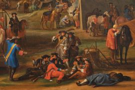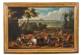 Nominato “Peintre ordinaire du Roi” nel 1673, anno in cui entrò a far parte della Académie des Peintres, Van der Meulen replicò infatti, su richiesta reale, le tele di grandi dimensioni che ne documentavano le imprese militare realizzandone versioni minori destinati ai castelli e alle residenze aristocratiche. Tra queste, il dipinto qui offerto costituisce un ottimo esempio delle sue accurate vedute topografiche animate nel primo piano da scene di vita militare con veri e propri ritratti. La verosimiglianza dei luoghi e delle singole scene è testimoniata dai numerosissimi disegni eseguiti dal pittore fiammingo e relativi ai luoghi visitati al seguito dell’Armata, come risulta dai documenti che certificano i suoi viaggi, e dagli studi di figure e cavalli che costituiscono il suo ricchissimo corpus grafico.