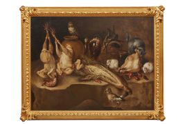 POULTRY AND VEGETABLES ON A STONE LEDGE WITH A CALF’S HEAD