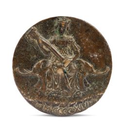 in bronzo; D/ “SIGISMVNDVS PANDVLFVS MALATESTIS S RO ECL C GENERALIS” Busto verso sinistra; R/ “MCCCCXLVI” Personificazione della Fortezza con corona, armatura e lunga veste, con il tipico attributo della colonna spezzata e seduta su due elefanti, emblema dei Malatesta; fusione postuma, custodita in una scatola coeva in rosso marocchino con fregi in oro, diam. mm 82