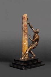 La figura è una vera e propria citazione da uno dei due personaggi dei Cavalli di Marly (“Chevaux de Marly”), un colossale gruppo scultoreo realizzato in marmo di Carrara da Guillaume Coustou, nipote e allievo di Antoine Coysevox. Raffigurante due cavalli impennati con il loro “domatore”, l’opera fu commissionata da Luigi XV di Francia per l’Abreuvoir del castello di Marly e fu posta in opera nel 1745. Considerato da subito come un capolavoro della scultura nazionale francese, il gruppo riuscì a salvarsi dalla distruzione del Castello di Marly durante la rivoluzione francese e nel 1795 fu collocato, per ordine del pittore David, in Place de la Révolution (attuale Place de la Concorde) all'ingresso agli Champs-Élysées; sostituito in seguito da una copia, si trova oggi all’interno del Louvre. Il notevole successo che il gruppo ebbe fin da subito è ben dimostrato dalle numerose repliche del quale fu oggetto, molte delle quali in scala ridotta, tra le quali si può annoverare il nostro esemplare. La particolare composizione, in cui il domatore di cavalli diventa uno schiavo incatenato a una sorta di essenziale capriccio architettonico composto da una colonna di marmo in rovina, ci porta ad avvicinare quest’opera a quella particolare tipologia di “souvenir” che gli artisti del tempo realizzavano per coloro che intraprendevano il Grand Tour, viaggiatori desiderosi di portarsi al casa, al rientro, un ricordo della loro avventura alla scoperta dell’Europa.