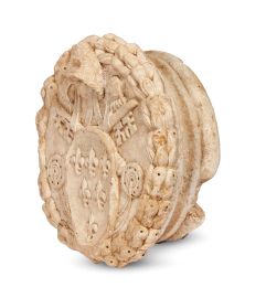 in marmo scolpito, al centro scudo a sei gigli seminati nella classica formazione 3-2-1 circondato dai simboli della dignità pontificia, le chiavi decussate e la tiara, entro ghirlanda di frutti e foglie, alt. cm 23, diam. cm 50