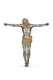 in argento parzialmente dorato, raffigurato secondo la tipologia del Christus patiens, cm 11,5x11, montato su pannello rivestito in tessuto rosso di forma centinata, cm 18,5x13,4x7,5