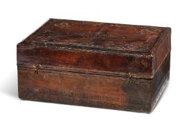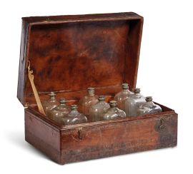 di forma rettangolare rivestito in cuoio impresso su tutti i lati a profilature vegetali stilizzate, coperchio ornato da motivi a volute vegetali, all’interno nove piccole bottiglie in vetro di forma quadrangolare impreziosite su tutte le facce da incisioni a motivi vegetali stilizzati poste entro alloggi, cm 16x35x24,2