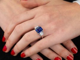 in oro bianco 18kt, zaffiro taglio ottagonale di ct 6.50 circa, diamanti taglio smeraldo per ct 1.40 circa, mis. 15, firmato "G Veronesi", punzone 750, gr 6