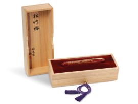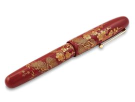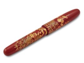 Simplicity and classic design are synonymous with this Red Urushi pen from Namiki. Featuring an "Emperor" sized body, this pen shows a decorative Maki-e motif known as " Three Friends of Winter " ("Suihan Sanyou"), that is the Pine, Bamboo and plum, depicted together as they share the fact that they do not wither in the winter season, unlike many other plants. Together they symbolize constancy, perseverance, and resilience in oriental culture.