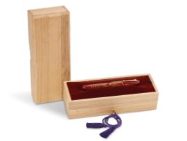 collezione "Emperor", fusto in lacca rossa "urushi" con decorazione "maki-e", raffigurante rami e fiori di alberi che raccontano il Giappone come l'eucalipto e i fiori di ciliegio, firmata dall'artista "Masaru Hayashi", pennino oro 14kt misura M, lungh. 17 cm, caricamento a contagocce di sicurezza. Corredata di scatola, firmata "Pino, Bamboo e prugna" 松竹梅 国光會 勝
