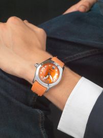 cassa avvitata in acciaio con fondello trasparente, quadrante arancio con datario, movimento a carica automatica, vetro minerale bombato, cinturino in pelle con fibbia deployante in acciaio