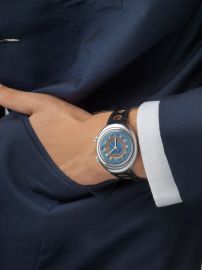 cassa ovale in acciaio, quadrante bicolore blu soleil con disco centrale per lo svegliarino color arancio, indici applicati, datario a 3, movimento a carica automatica cal 916 con sveglia meccanica, cinturino in pelle, vetro plastica. Dim mm 38x45