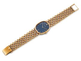 cassa in oro giallo 18kt, quadrante blu con indici applicati con “sigma”, vetro minerale, movimento a carica manuale cal 23-300PM, bracciale a maglie aperte in oro giallo 18 kt, lungh. bracciale cm 18. Dim mm 27x32