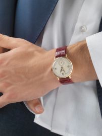 cassa in oro giallo, quadrante argentè con indici e numeri arabi, sferino secondi al 6, vetro plastica, movimento a carica manuale, cinturino in pelle con fibbia. Diam mm 34