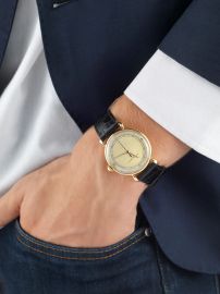 cassa in oro giallo con anse a goccia, corona a cappello di prete, quadrante bicolore con indici e numeri romani applicati, vetro plastica, movimento a carica manuale cal P454/5c, cinturino in pelle con fibbia in oro giallo. Diam mm 35
