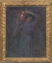 Nel dipinto Fanciulla con brocca che presentiamo in asta ritroviamo l’intimismo lirico di Plinio Nomellini. Carlo Carrà scrive, a proposito dell’esposizione che Nomellinini aveva inaugurato alla Galleria Pesaro di Milano nel 1924, “aveva espresso con grande chiarezza i motivi che gli facevano preferire non le tele rutilanti e cariche di simboli e di letteratura, ma le impressioni vergini consegnate in piccole tele e in acquarelli”. Il dipinto divisionista è tutto incentrato sui toni del blu, intervallato da tratti verdi e rossi, tanto che la figura della fanciulla quasi non si distingue dallo sfondo. La brocca, sicuramente piena d’acqua, che la ragazza porta sulla spalla destra, spicca con il suo bagliore. Il divisionismo di Nomellini è istintuale, i colori utilizzati puri, accostati ma non mescolati sono veicolo di emozione e luce, tramite pennellate brevi e regolari tese a dare unità alla visione.