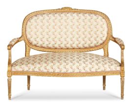 in legno laccato e dorato, schienale di forma ovale inquadrato da doppia bordura a ovoli ricorrenti e a motivo di nastro ritorto ornato al centro superiore da festone di frutti e foglie trattenuto da fiocchi, braccioli imbottiti di linea mossa su sostegni scanalati ornati alla base da motivi fogliacei, grembiale intagliato a nastro ritorto su gambe troncoconiche che si dipartono da dadi angolari centrati da fiori, seduta a schienale rivestiti in tessuto a fiori su fondo avorio, divano cm 98x128x58, poltrone alt. cm 101,5