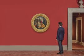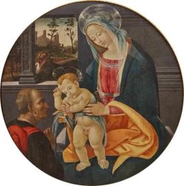 La posa slanciata del Bambino, proteso verso il donatore, ripropone invece un tema già affrontato dal maestro nella vetrata della cappella Strozzi di Santa Maria Novella e nel tondo con la Sacra Famiglia del Museum of Art di Cleveland (cat. 42), dipinto subito dopo il soggiorno romano di Filippino: in quest’ultima sono poi presenti altri elementi caratterizzanti anche il tondo presentato quali l’attenzione per l’espressività delle fisionomie soprattutto dei personaggi maschili – nel nostro caso la sorta di ritratto del donatore in ginocchio – e la conoscenza diretta dell’antico rivelata dai rilevi sui pilastri alle spalle della Madonna.