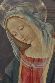 La tipologia e fisionomia della Madonna mostra strette affinità con la cosiddetta Madonna Strozzi del Metropolitan Museum di New York (Zambrano, Nelson 2004 cit., cat. 33), tipologia che si trova poi ulteriormente messa a punto nella Pala Rucellai (Londra, National Gallery, cat. 34) e in quella di Palazzo Vecchio (Firenze, Galleria degli Uffizi, cat. 35). Si tratta di una notevole trasformazione della figura della Vergine dalla quale nascerà il tipo di Madonna dai capelli fulvi chiusa entro amplissimi manti, con la testa avvolta da veli, ricorrente nelle opere a partire dalla metà degli anni 80 e oltre e così in quella qui offerta.