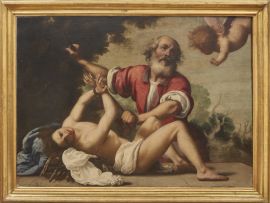 Non stupisce quindi scoprire che l’episodio biblico del Sacrificio di Isacco compaia tra i suoi temi preferiti, e che Felice Ficherelli ne dipingesse almeno tre versioni diverse, poi replicate in ulteriori esemplari. qualunque ne sia il formato, alla figura eretta e vigorosa di Abramo, sempre vestito di rosso, si contrappone il bel nudo di Isacco, abbandonato in primo piano e appena velato da bianchi panneggi. una certa predilezione descrittiva introduce elementi ulteriori e talvolta incongrui come il turibolo e la navicella nella versione verticale del tema, o come la legna del sacrificio accuratamente disposta sotto il capo della vittima, nel nostro.