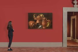 Pendant di un dipinto firmato “G. Ruoppoli”, oggi di ubicazione sconosciuta ma di cui esiste documentazione fotografica (Fototeca Zeri, inv. 209035), la peculiare natura morta mostra il pittore napoletano cimentarsi in una particolare declinazione di questo genere pittorico su cui si era soffermato anche Bernardo De Domenicis nelle notizie biografiche dedicate a questo artista: “Dipinse anch’egli ad imitazione del suo zio Gio: Battista cose di rame, che furono a’ suoi tempi tenuti in pregio per esser naturalissime, e con buon componimento messe insieme” (B. De Dominici, Vite de’ pittori, scultori, ed architetti napoletani, III, Napoli 1743, p. 299).