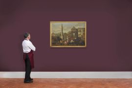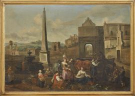 Le piazze della città, trascritte in ricordi talvolta imprecisi e contaminati con incisioni, continuarono a nutrire la sua fantasia anche dopo il ritorno in patria, dove si specializzò nel genere Italianizzante messo alla moda negli stessi anni da Johannes Lingelbach ad Amsterdam, e da Anton Goubau ad Anversa. Quasi sempre dedicate alle attività del mercato, occasione di gustosi brani di natura morta, le sue scene a piccole figure sono ambientate sullo sfondo di Campo Vaccino, del Vaticano o, come in questo caso, di piazza del Popolo. Sullo sfondo, l’antica Porta Flaminia si presenta rinnovata a seguito dell’ingresso di Cristina di Svezia nel 1655, offrendo un elemento di datazione per il nostro dipinto.
