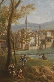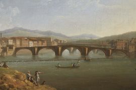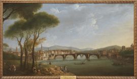Il dipinto ripete variandone le figure una veduta eseguita nel 1771 per Horace Mann, console inglese a Firenze, amico e protettore di Thomas Patch. Secondo un uso inaugurato da Gaspar van Wittel e utilizzato dal grande vedutista olandese anche nei suoi soggetti fiorentini, questa veduta era stata eseguita in pendant con quella opposta, che mostra l’Arno e la Zecca Vecchia a San Niccolò, quest’ultima più volte replicata.