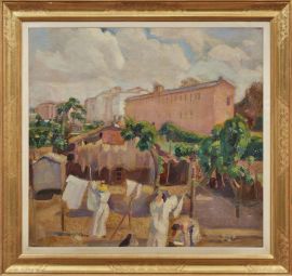 Già affascinato dalla produzione toscana quattrocentesca e dalle cromie luminose di Tiziano, a Roma Spadini trova numerosi nuovi stimoli avvicinandosi alla produzione artistica legata alla tradizione rinascimentale e al realismo caravaggesco. La sua capacità di interpretare il presente mescolando suggestioni del mondo pittorico passato è unica. Il suo nome è già noto quando, nel 1916, si trasferisce con la famiglia nella casa di via Emilio del Cavaliere, ai Parioli, quartiere a quell'epoca in grande espansione. Con il suo estro creativo stupefacente e con quella spontanea virtù che si traduce in una pittura luminosa e in un'amorosa intimità d'invenzione, si dedica a diverse vedute di via Paisiello dominate da un grande edificio color rosa, un antico monastero, dove, dal 1904, vive Giacomo Balla. La necessità di cercare la natura e di immergersi nei suoi spazi e nelle sue tinte, Spadini la soddisfa a un passo da casa, orientando lo sguardo verso il Parco di Villa Borghese, spesso protagonista delle sue vedute all'aperto. Nei vari dipinti eseguiti dalla sua finestra, egli segue la mutazione del paesaggio, della vegetazione di orti e giardini e dei palazzi in costruzione. In questa versione, caratterizzata dalle tonalità morbide delle tinte delle case, del terreno, di nuvole e lenzuola svolazzanti, in contrasto con il verde intenso della flora rigogliosa, il pittore raffigura tre donne impegnate a stendere la biancheria al sole.