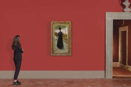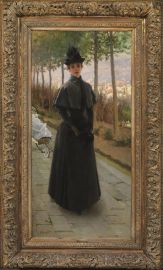 Una giovane passeggia lungo una strada costeggiata da piccoli alberi che si affacciano sulle colline di Firenze. Con il suo viso ovale, gli occhi intensi, il naso lungo e stretto, la ragazza ci guarda con espressione assorta. Il suo corpo è interamente coperto da un abito elegante, di stoffa grigio scura, rimane nuda solo la delicata pelle del viso. I capelli neri, raccolti dietro la nuca, sono nascosti da un cappello alla moda. Siamo nel 1890 quando Corcos, rientrato in Italia da Parigi già da qualche anno, vive a Firenze dove si è trasferito subito dopo il matrimonio con Emma Ciabatti, celebrato nel 1886 a Livorno. La fine del suo soggiorno parigino, durante il quale il pittore si era distinto come raffinato ritrattista della scuderia Goupil, non segna la cessione del contratto con la celebre Maison e questo ritratto rientra a pieno titolo in quelle tele di gusto francese dalla ricercata eleganza borghese e con quel tocco di frivolezza dato dalla carrozzina alle spalle dell’effigiata. Concentrato com’è a osservare la giovane durante sua passeggiata, l’artista sembra poco interessato al bambino, di cui accenna solo una manina libera dal tessuto bianco spumeggiante che ricopre la carrozzina. Una scelta simile verrà adottata due anni dopo nel dipinto Le istitutrici ai Campi Elisi (Palazzo Foresti, Carpi) in cui vediamo, in primo piano, a sinistra, una bambina accucciata intenta a giocare con sabbia e formine, vestita con una cuffia bianca di pizzo calata sulla testa che cela completamente il volto.