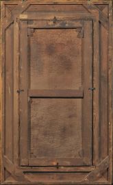 Il rientro in Italia e la frequentazione degli amici macchiaioli non discostano Corcos dal genere di ritrattistica su committenza che gli assicura un guadagno adeguato per mantenere con agio la sua famiglia. Egli ormai si è affermato come il ritrattista delle donne, della loro grazia ed eleganza, dei dettagli, anche minimi, descritti con una precisione quasi maniacale, che raggiungono degli apici sorprendenti nella resa dei tessuti. Spesso però ama lasciare nei suoi quadri lo spazio per un’indagine paesaggistica come in questo piacevole sfondo, illuminato dai raggi solari, che prende vita gettando l’occhio oltre la fila regolare di alberi cresciuti lungo il vialetto. Si tratta di una descrizione naturalistica delle colline di Fiesole che richiama quella raffigurata da Corcos tre anni prima in un altro ritratto femminile, grande al vero, proveniente dalla collezione di Gaspare Gussoni e presentato alla Biennale di Venezia nel 1934 nell’ambito della Mostra Internazionale del Ritratto dell’Ottocento. In quel caso la figura femminile è colta nell’atrio di un palazzo, qui invece l’ambiente all’aperto della periferia cittadina avvolge completamente la giovane effigiata.