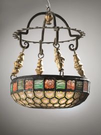 A CHANDELIER, PAINTED GLASS, WROUGHT IRON AND CERAMIC DECORS