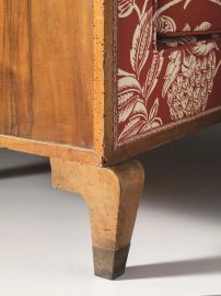 con struttura in legno intarsiata, puntali in ottone e rivestimento in tessuto