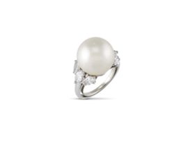 in platino, al centro una perla “South Sea” di mm 13 circa, affiancato da diamanti taglio navette per ct 1.50 circa, firmato "Bulgari", mis. 12, punzone PT, gr. 10. Corredato di scatola.