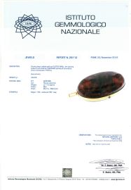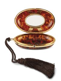 in guscio di tartaruga e dettagli di finitura in oro giallo 18kt, di forma ovale, bottone con zaffiro birmano taglio cabochon di ct 1.10 circa, dotata di specchio all'interno, firmata "Bulgari", punzone 18kt, dim. cm 15x9,5x4, gr. 464. Corredato di cordicella torchon in seta marrone, certificato CITES e di certificato IGN del 20/11/2019 attestante l'origine dello zaffiro e l'assenza di trattamenti termici.
