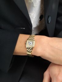 cassa in oro giallo 18kt, fondello serrato con viti, lunetta in oro giallo con brillanti, quadrante bianco, grafica nera con numeri romani stampati, movimento al quarzo, bracciale in oro giallo 18kt, chiusura doppia deployant marcata Cartier, vetro minerale, gr. 67 circa complessivi. Corredato di scatola, garanzia e libretto. Dim. mm 22x30