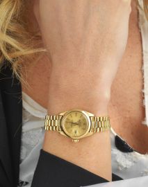 cassa in oro giallo 18kt, fondello a vite, ghiera liscia in oro giallo 18kt, quadrante champagne, grafica nera, indici applicati, datario a ore 3, movimento a carica automatica cal. 2030, bracciale president con fibbia deployant in oro giallo 18kt, lungh. cm 13, vetro plastica. Diam. mm 26