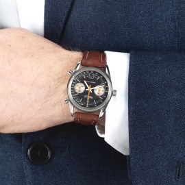 cassa in acciaio, fondello a vite, tasti cronografici a pompa, corona di carica a ore 9, anse elicoidali, quadrante nero, ghiera mancante, grafica bianca, indici al trizio, datario a ore 6, movimento a carica manuale cal. cal12, cinturino in pelle, fibbia in acciaio, vetro plastica. Diam. mm 37