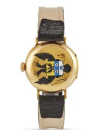 cassa in oro giallo 18kt con chiusura a doppia cerniera, anse fisse, fondello con stemma nobiliare in smalto, quadrante porcellana, grafica nera, numeri romani, movimento a carica manuale n. 1098XX, cinturino in pelle. Diam. mm 28