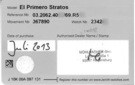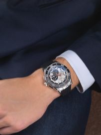 L'orologio che ha accompagnato il paracadutista austriaco Felix Baumgartner nella sua storica impresa di un salto nel vuoto di 39.045 metri superando il muro del suono. Al suo polso lo Zenith El primero Stratos Flyback, strumento cronografico che ha permesso di misurare il decimo di secondo per tutta la durata della missione Stratos.