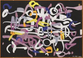 La tempera su carta qui raffigurata è del 1954, un anno di imprescindibile svolta, in cui l’incontro con il critico Michel Tapié determinò il passaggio dalla pittura costruttivo-concretista alla purezza del “segno”. Non un algoritmo assoluto e immutabile come quello di Giuseppe Capogrossi, ma piuttosto un intimo alfabeto, che si dirama in intrecci astratti ondeggianti e sinuosi, nati dall’alternanza di pieni e di vuoti, da contrasti di colori e da accostamenti di luce.