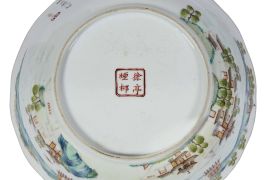 in porcellana policroma dipinta con palazzo e fiume, scritte e marchio sotto la base “Xu Tin Yin Liu”; diam. cm 18