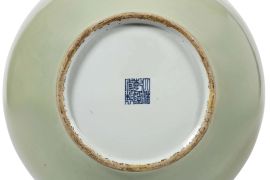 in porcellana color celadon, con paesaggi dipinti entro riserve; alt. cm 46