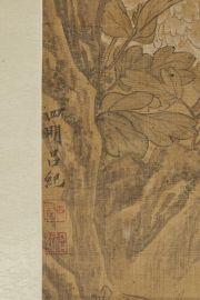 su seta con uccelli su rami fioriti e rocce, firmato Lu Ji e sigillo; seta cm 94x49