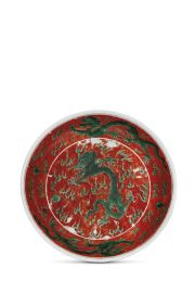 decorato con draghi verdi che volano fra le nuvole e palle di fuoco su sfondo rosso ferro; diam. cm 22
