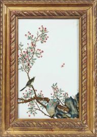 in porcellana policroma dipinta con volatile su ramo fiorito; cm 25,8x39,4