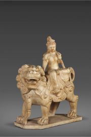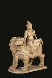 in marmo raffigurante guanyin seduta su leone; alt. cm 47