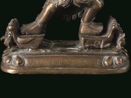 in bronzo brunito e policromo raffigurante yamantaka vajrabhairava in posizione eretta su doppia base a fior di loto con in mano una calotta di un cranio e una lama, il viso feroce di toro sormontato da teschi e facce aggiuntive sovrapposte e tracce di policromia sul viso e sui capelli; alt. cm 19,4
