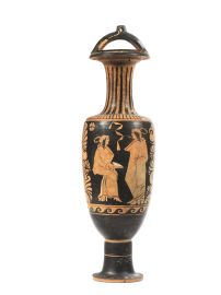 Bail amphora (situla) con labbro rovesciato, ansa orizzontale a ponticello impostata sull'orlo, lungo collo cilindrico, corpo ovoide, alto piede a tromba. La decorazione figurata consiste sul lato A in due figure sedute con phiale nella sinistra, un giovane guerriero con scudo sollevato in piedi, davanti ad un’erma itifallica barbata. Sul lato B si vedono due figure femminili, ammantate e affrontate: una, seduta, regge nella destra una phiale, mentre l’altra è in piedi, in posa stante. La decorazione secondaria consiste in un motivo a linee parallele verticali sul collo, tratti verticali sulla spalla e sotto la scena in un motivo ad onde. Elaborate girali vegetali separano le due scene figurate sui lati del vaso. H. 52 cm; diam. orlo 14 cm.
