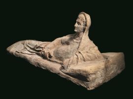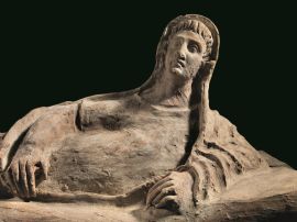 Sarcofago in terracotta. Il defunto, con tunica a maniche corte e mantello passato sul capo, è raffigurato come se partecipasse ad un banchetto, recumbente su una kline, con il piede destro disposto in orizzontale ed il sinistro di lato. L’uomo ha i capelli disposti a ciocche allungate sulla fronte, volto allungato, arcate sopracciliari ben rilevate, grandi occhi, naso diritto e mento pronunciato. Un anello con castone circolare all’anulare della mano sinistra vuole caratterizzare l’uomo come una figura socialmente prestigiosa. Lungh. complessiva 180 cm. H. max. 60 cm.