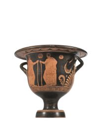 Cratere a campana con orlo a tesa ingrossato nella sua terminazione, corpo campaniforme, piede cilindrico con alto stelo, due anse orizzontali a profilo ricurvo. La decorazione, a figure rosse, consiste sul lato A in un Eros androgino che porge con la sinistra uno specchio ad una figura femminile seduta su di una roccia che regge con la sinistra un flabello e con la destra una grande phiale. Numerosi dettagli sono resi in vernice bianco-gialla sovraddipinta. Sul lato B scena di palestra con giovani ammantati che si reggono a un bastone. Sopra di loro sono tre coppie di halteres (pesi usati per il salto in lungo). La decorazione secondaria consiste in un tralcio di olivo o alloro sul rovescio della tesa, una fila di meandri e croci alla base della scena, due palmette fra girali vegetali sotto le anse. H. 27,5 cm. Diam. orlo 31 cm.