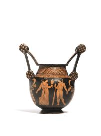 Questo vaso è una rara versione in ceramica a figure rosse di un vaso frequente nel repertorio vascolare dei popoli dell’Italia meridionale: M.A. Sisto, Nestorides, in Ostraka 15, 2006, 363-406; S. Schierup, The Nestorides. Innovation and ambivalence in the early south Italian red-figure production, in Acta Hyperborea 14, 2015, 387-425. Il vaso, come le altre nestorides a figure rosse, costituisce una testimonianza dell’ibridazione culturale attiva in Italia meridionale del IV secolo a.C. dove ceramografi di formazione greca realizzavano per committenti indigeni o italioti selezionati prodotti dall’aspetto ‘anomalo’.