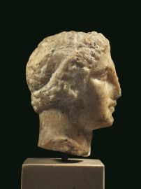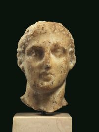 Testa di giovane in marmo bianco a grandi cristalli, fratta alla base del collo ed in torsione, come attestato dalla marcata asimmetria del collo. Il volto, allungato, è ovale. Nonostante siano alterati da una leggera abrasione i lineamenti sono leggibili: labbra piccole e carnose, naso diritto con profilo greco, grandi occhi ovali spalancati, orecchi piccole, tondeggianti ed irregolari. La capigliatura si compone di corte ciocche mosse. H. 8 cm.