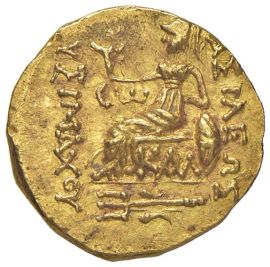 Statere in oro. D: testa diademata di Alessandro Magno con corna di Zeus Ammone a destra. R: BAΣIΛEΩΣ ΛYΣIMAXOY, dea Atena seduta a sinistra, con il gomito sinistro appoggiato allo scudo, raffigurata mentre regge una Nike sulla destra portata in avanti. Sopra il ginocchio monogramma, sul trono KAΛ. In esergo tridente. Diam. mm. 18. Peso g. 8,26.