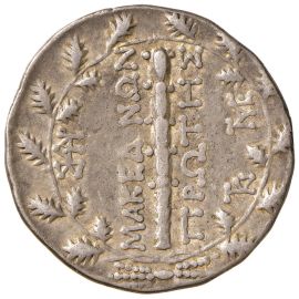 Tetradramma in argento. D: scudo macedone al cui centro è testa di Artemide a destra entro bordo perlinato. Dietro alla testa della dea si vedono un arco ed una faretra. R: clava lignea posta verticalmente e rivolta verso l'alto, ai cui lati dal basso verso l'alto si legge: ΜΑΚΕΔΟΝΩΝ / ΠΡΩΤΗΣ e sopra un gruppo di lettere in nesso (ΣIAYΡ ?), sotto due monogrammi TKE and TME. Il tutto entro una corona di quercia alla base della quale è visibile un fulmine. Peso 16,53 gr. Diam. 32 mm.